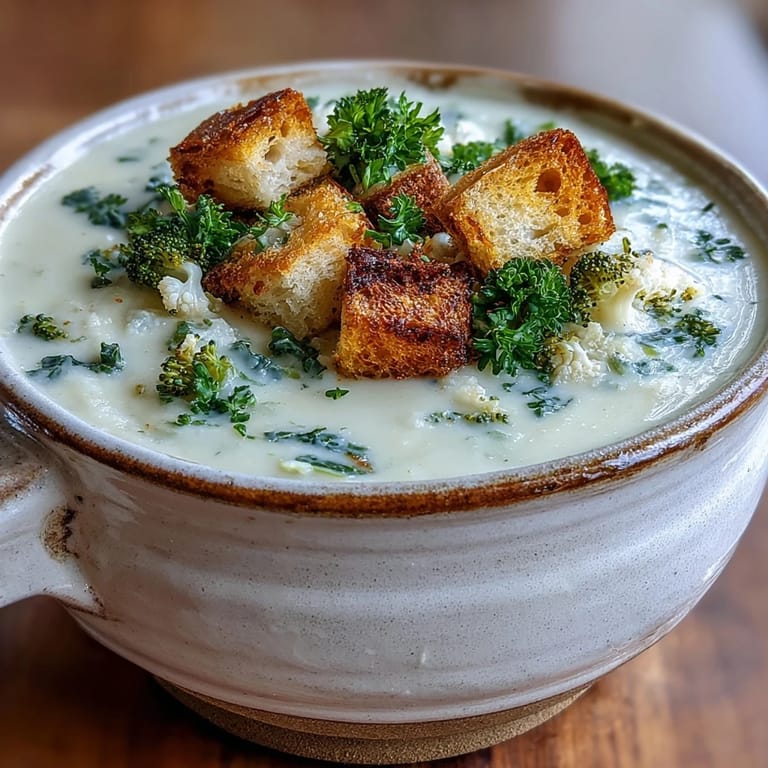 Save There's something about the smell of vegetables softening in olive oil on a gray afternoon that makes you forget you're cooking something as simple as soup. My neighbor knocked on my door one October with a bag of overflowing broccoli and cauliflower from her garden, and I suddenly had to figure out what to do with them before they wilted. That evening, this creamy green and white soup emerged from my pot, and it became the kind of dish that tastes like comfort without any fuss.